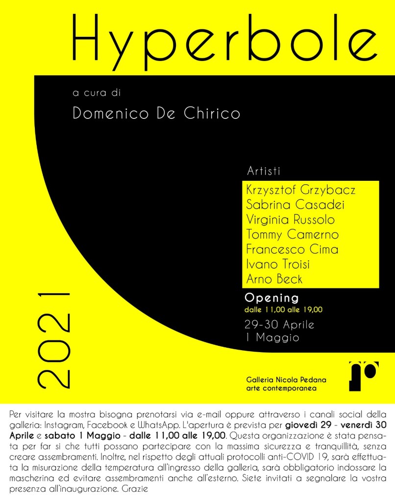 La galleria Nicola Pedana è lieta di presentare la mostra collettiva Hyperbole a cura di Domenico de Chirico. Giovedì 29, venerdì 30 aprile e sabato 1 maggio dalle ore 11:00 alle 19:00 orario continuo, presso gli spazi della galleria sita in P.zza Matteotti 60 Caserta.