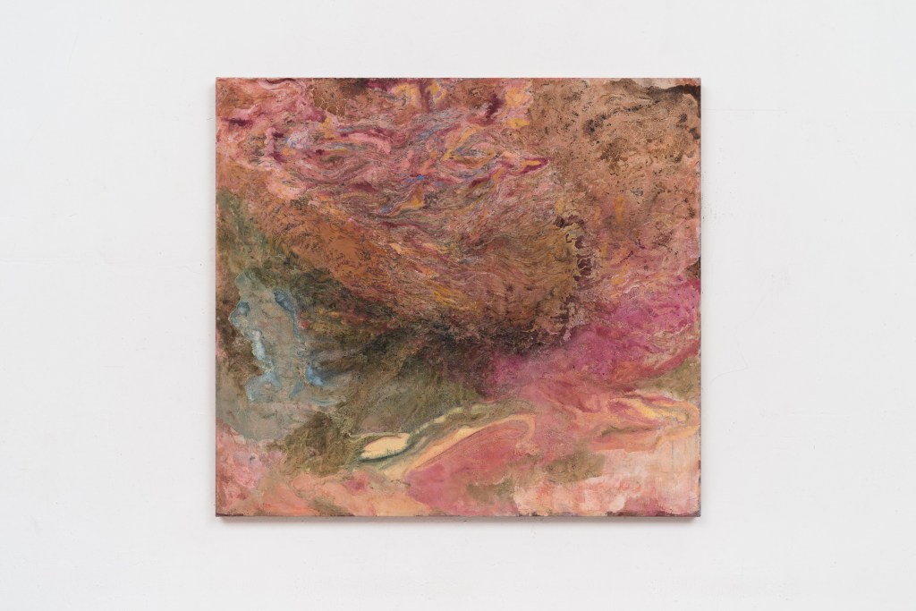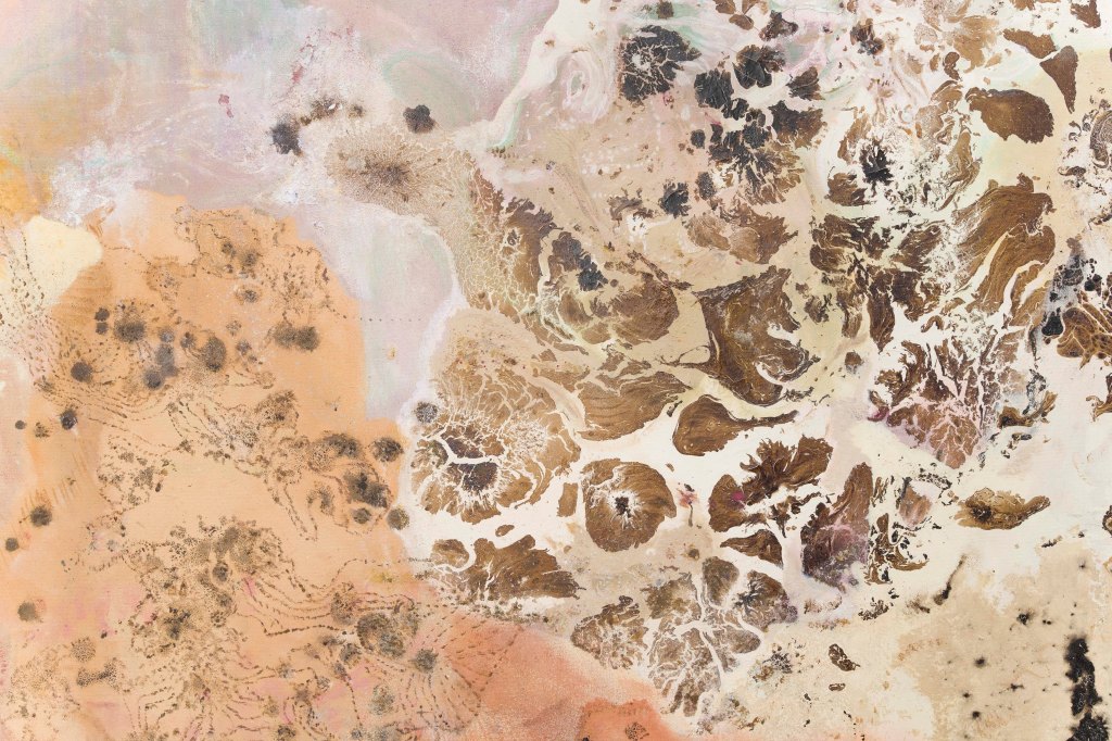 Each picture develops in a kaleidoscopic twine of intense embroidered signs, always and inevitably corrupted by the natural randomness of matter which expands, just as magma, overwhelming the canvas. Chromatic detonations of abstract forms – at times open-air landscapes, at times macro-organisms, or again plant germinations – which Casadei creates and handles sapiently. Liquid-looking morphological crystallisations invite us to measure our world’s complexity and its ungraspable semiotic qualities.