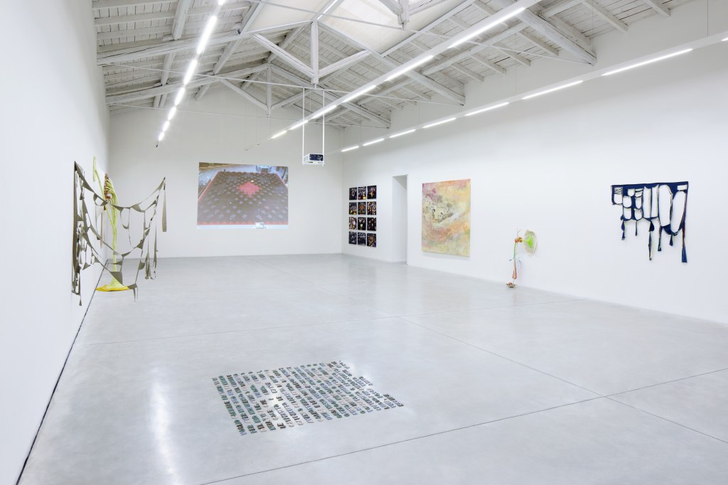 An exhibition which, in addition to the pictorial layer, appears literally ‘sewn’ together thanks to the use of cloth and webs which Casadei overlays and visually sums up. Filters which, instead of pushing the observer away, paradoxically invite it to enter into the canvas more intimately. This way smaller figurative details, otherwise lost in fluctuating color patches, can be discovered and appreciated not only as purely abstract elements. A mysterious equilibrium governs the works, laying suspended between hyperrealism and the absence of figurative elements, for which the indeterminacy of a viewpoint becomes the real and unavoidable constant.